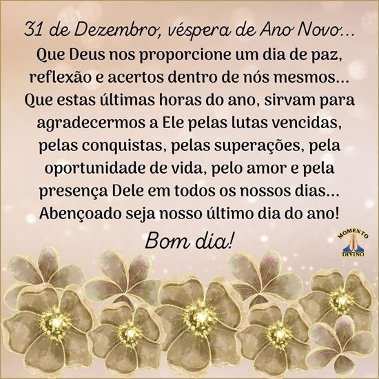 Que estas últimas horas do ano, sirvam para agradecermos a Ele pelas lutas vencidas, pelas conquistas, pelas superações, pela oportunidade de vida, pelo amor e pela presença Dele em todos os nossos dias...