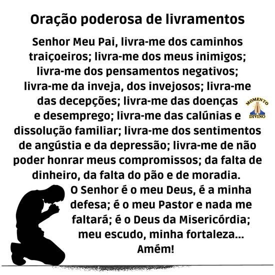 Senhor Meu Pai, livra-me dos caminhos traiçoeiros; livra-me dos meus inimigos; livra-me dos pensamentos negativos; livra-me da inveja, dos invejosos; livra-me das decepções; livra-me das doenças e desemprego; livra-me das calúnias e dissolução familiar; livra-me dos sentimentos de angústia e da depressão; livra-me de não poder honrar meus compromissos; da falta de dinheiro, da falta do pão e de moradia.