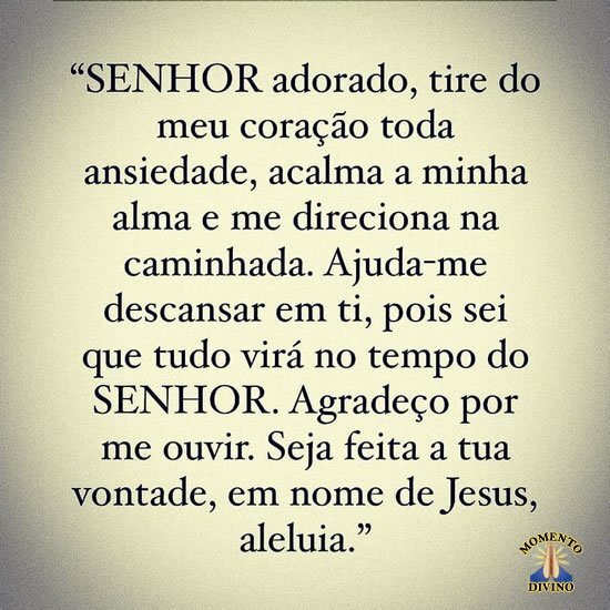 "Senhor adorado, tire do meu coração toda ansiedade, acalma a minha alma e me direciona na caminhada. Ajuda-me descansar em ti, pois sei que tudo virá no tempo do Senhor. Agradeço por me ouvir. Seja feita a tua vontade, em nome de Jesus, aleluia."